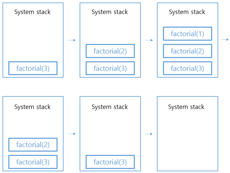 이와 같이 factorial(3)에서 시작하여 factorial(2), factorial(1)을 순차적으로 호출하는 것을 알 수 있다
