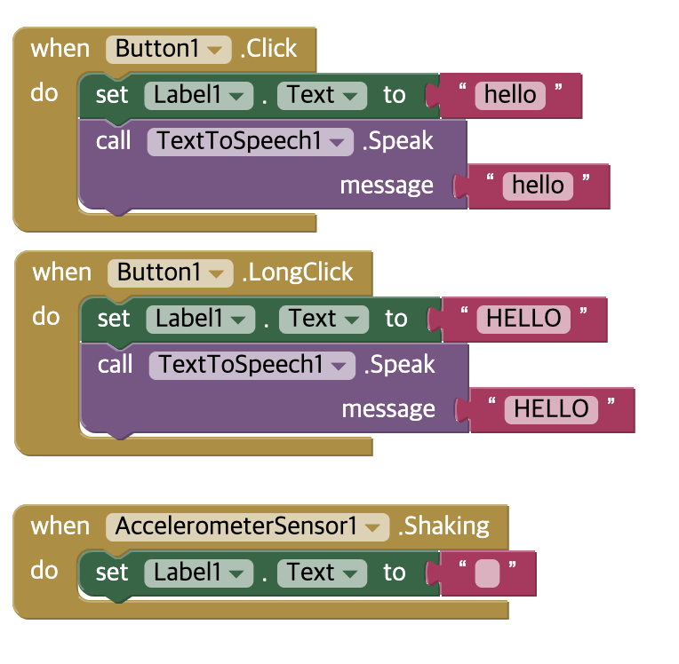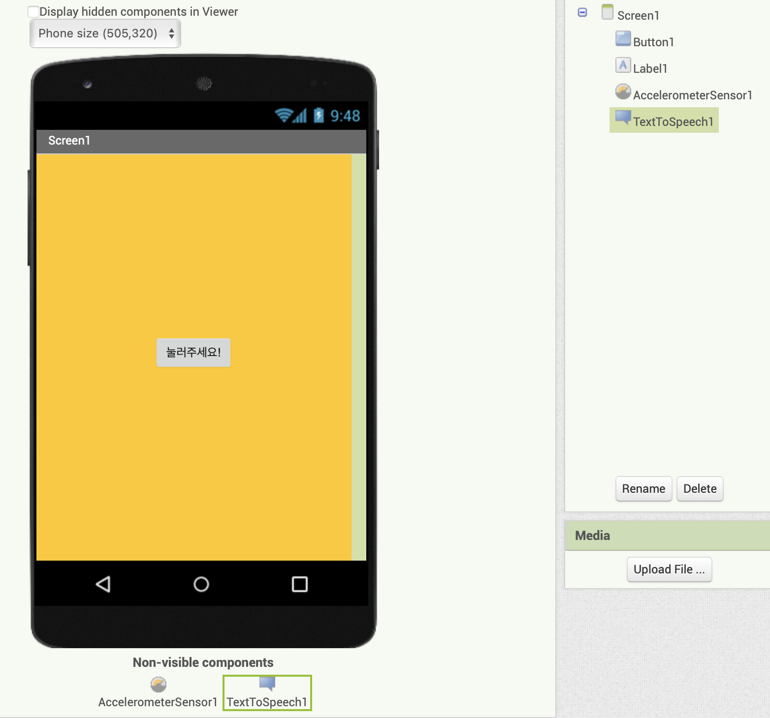 버튼을 누르면 스마트폰에서 글자를 읽을 수 있도록 Media 부분의 TextToSpeech도 넣어 주도록 하자.