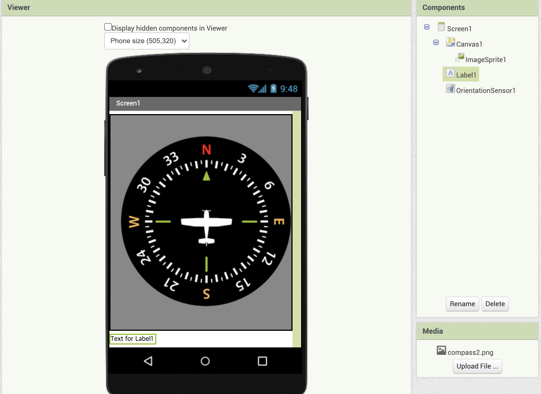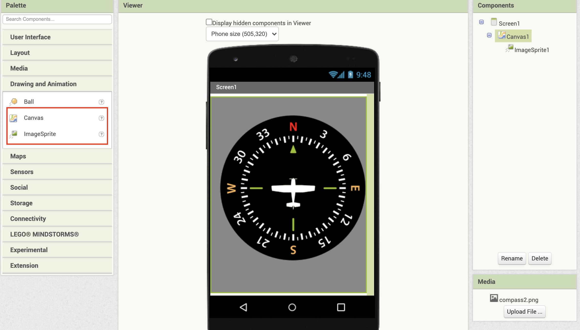 그림과 같이 현재 상태에는 canvas 위에 compass라는 image sprite 가 올라 와있는 상태이다.