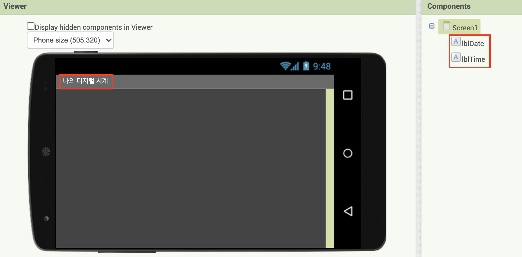 clock 컴포넌트를 이용하여 화면에 날짜와 시간을 표시하여준다.