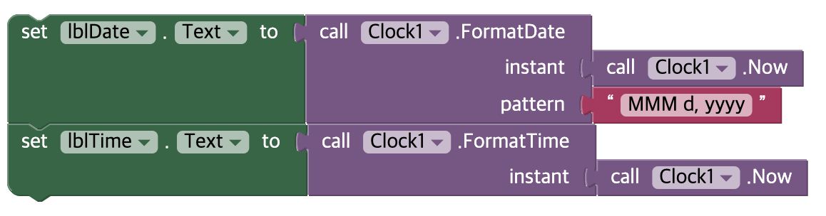 Label의 set.text 블록을 사용하여 시간을 바꿔주려면 다음과 같이 하면 된다.