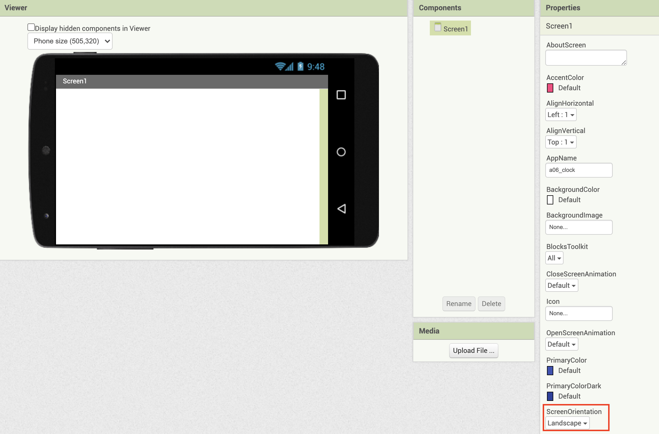 가로 출력을 디폴트로 만드려면 Screen Properties의 ScreenOrientation을 Landscape로 지정해 주면 된다.