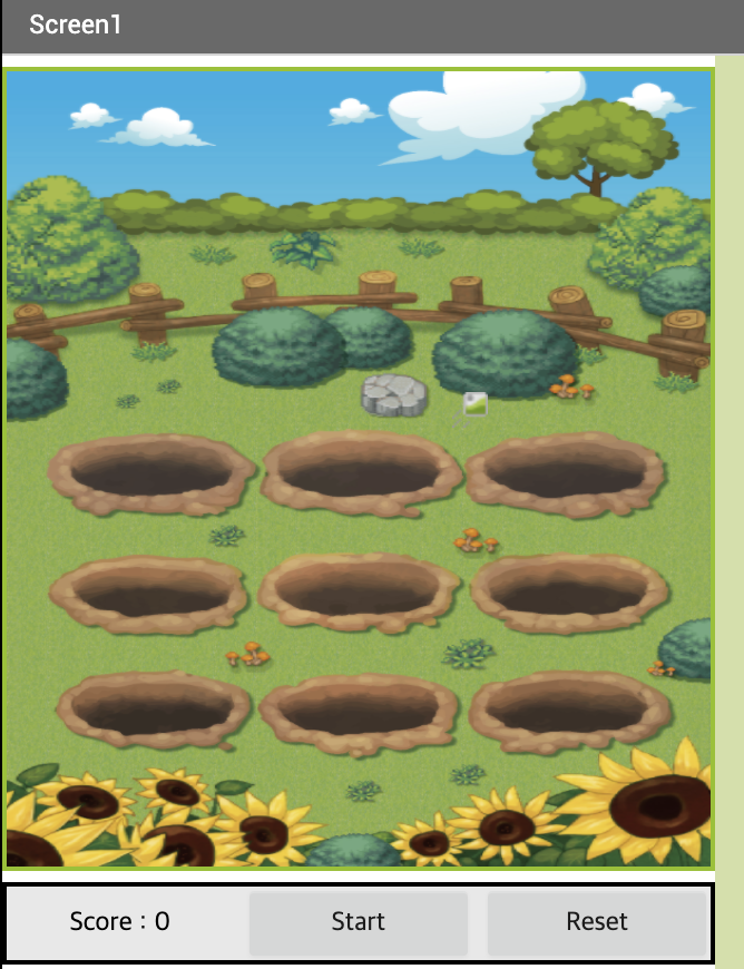 HorizontalScrollArrangement를 이용해서 점수판과 start버튼과 reset버튼을 만들어 주었다.