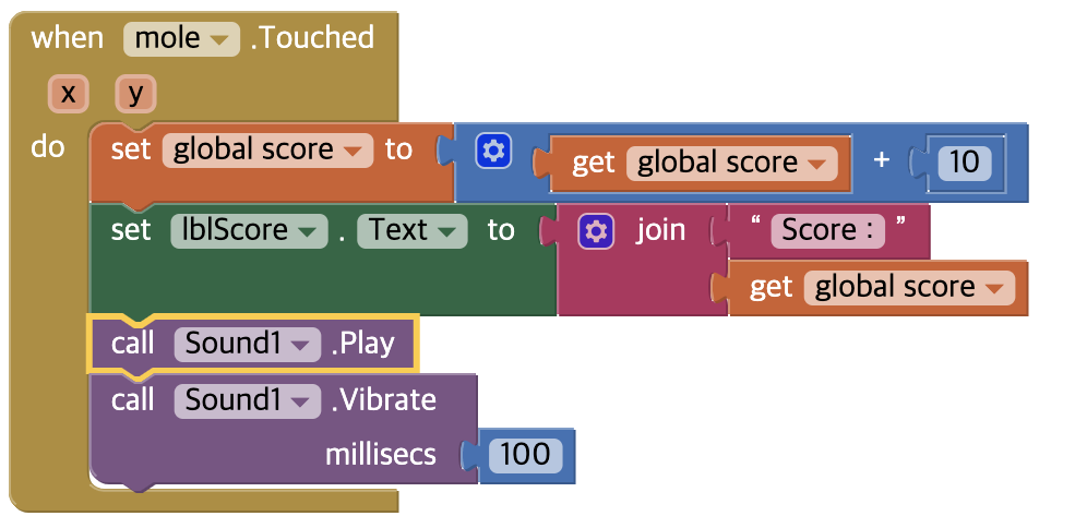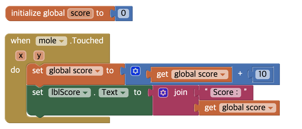 해당 변수를 만들고 두더지를 터치하면 점수가 오르게 코딩을 해보자