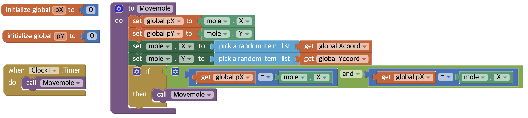 변수를 추가로 생성해주어서 다음에 나타날 x좌표와 y좌표를 알아낸 후, 현재와 동일하다면, 다시 Movemole 함수를 호출하는 방식으로 만들어 주었다. 이를 통해서 중복되는 위치에 연달아 두더지가 나오는 상황을 방지할 수 있고,