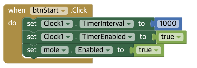 위 코드를 통해 시작버튼이 눌리면, clock이 1000밀리초 단위로 작동하고 mole의 상태도 enable될 것이다.