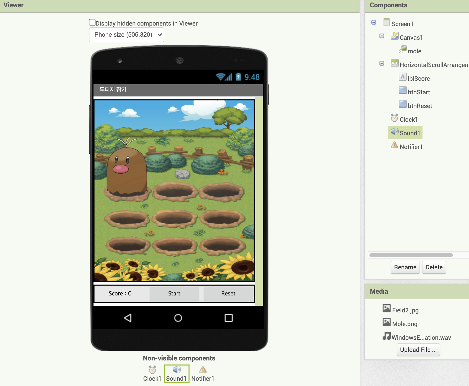 위 컴포넌트들이 추가되었고, sound의 경우 이미지를 넣는 방식으로 사운드파일을 넣어줄 수 있다.