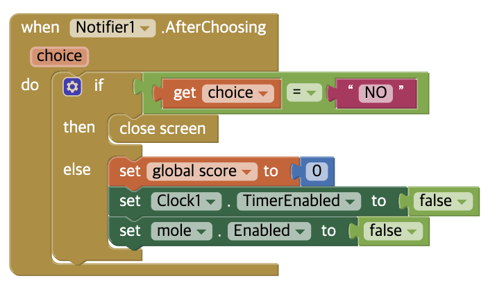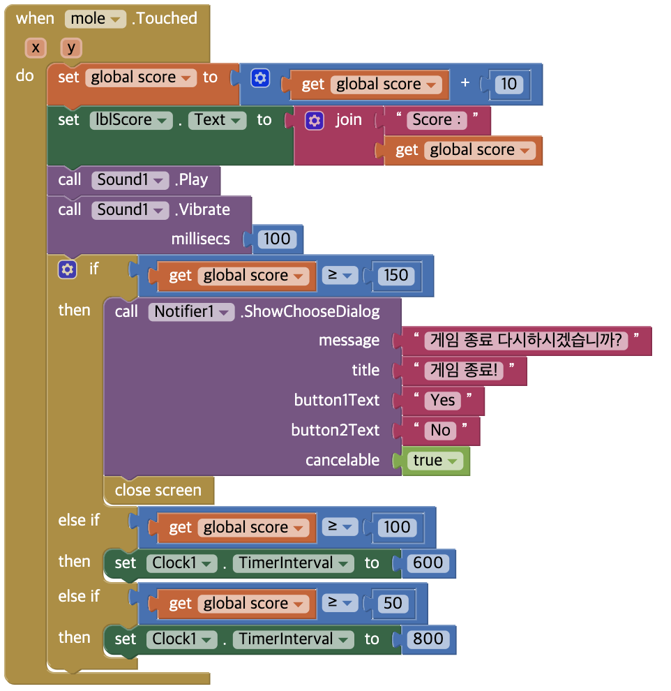 두더지를 5마리 잡으면 단계가 올라갈 것이고 총 15마리를 잡으면 Notifier를 이용하여 게임을 다시할 것인지