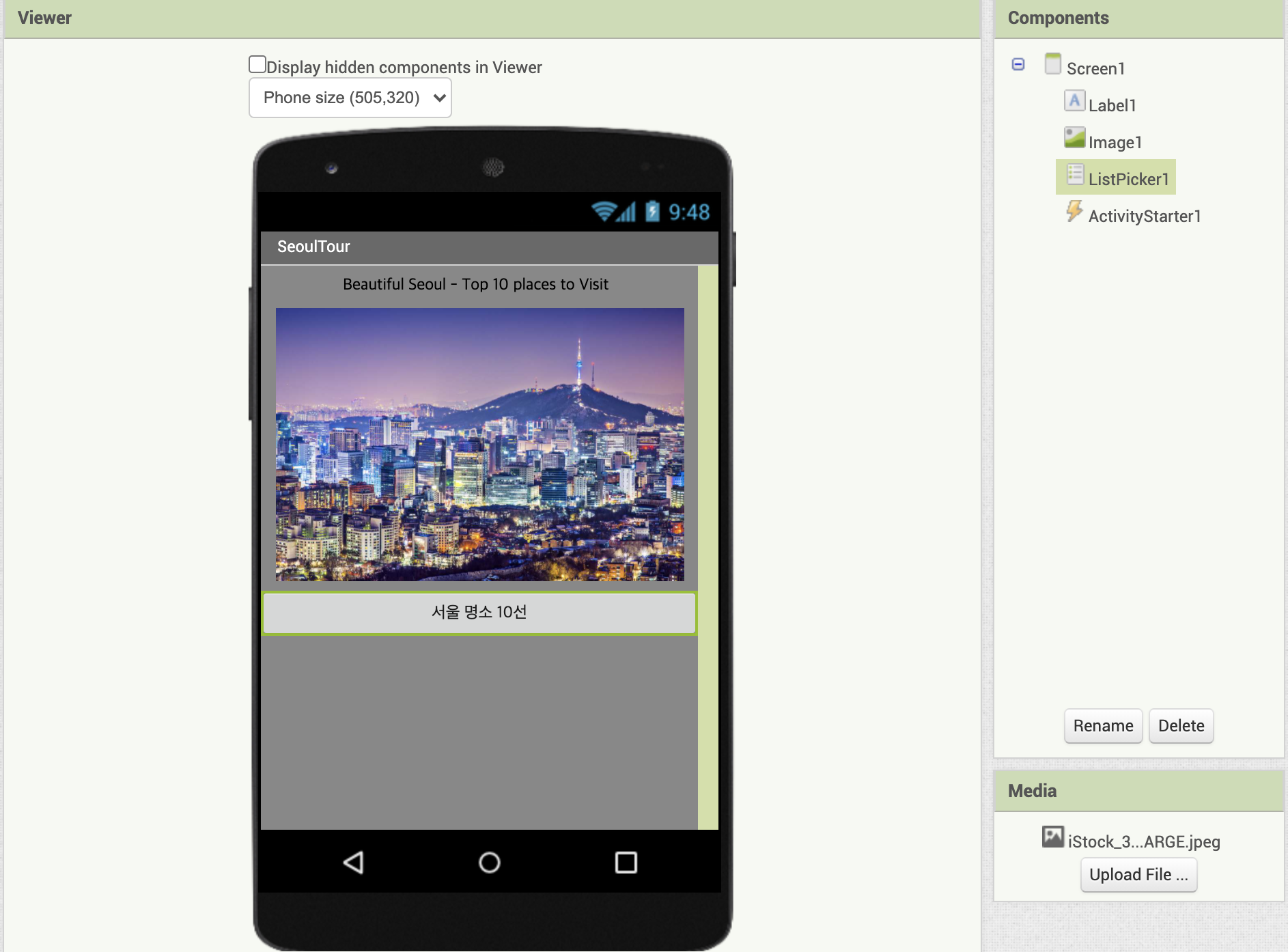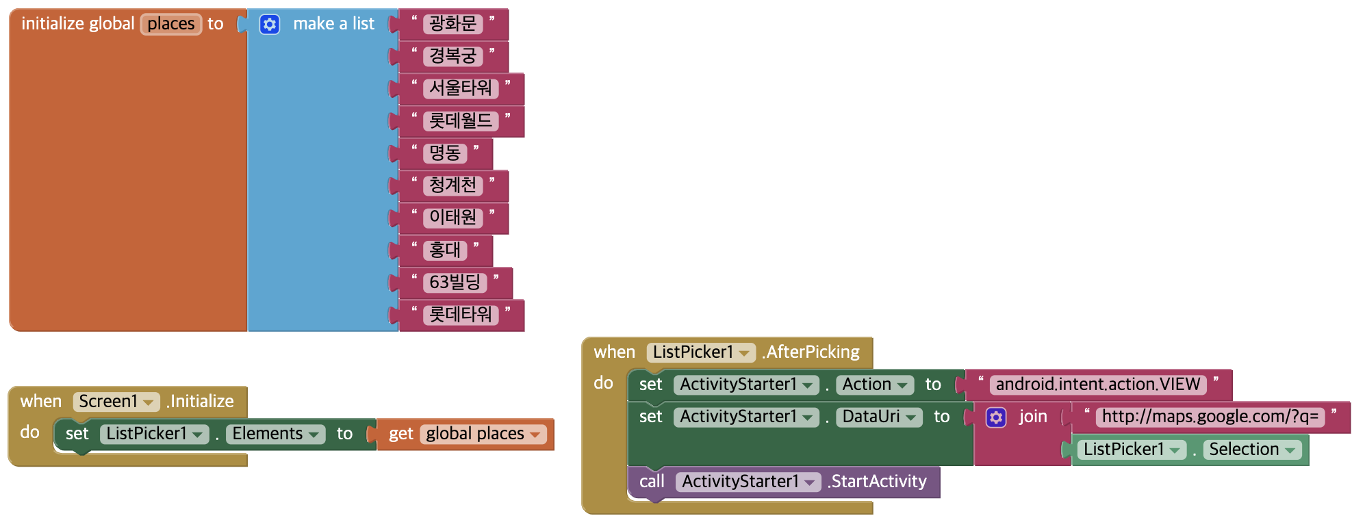 설명을 간단히 하자면, ListPicker로 리스트 안에 있는 장소 한 곳을 선택하면 구글맵을 통해서 검색을 하는 기능을 수행한다.