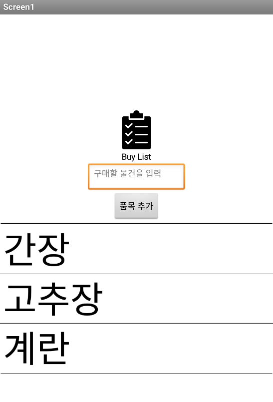 - TextBox에 할 일을 작성하고 "품목 추가" 버튼을 클릭하면 텍스트박스의 내용을 Products 리스트에 추가하며 새 항목이 추가된 리스트를 Tiny DB에 저장