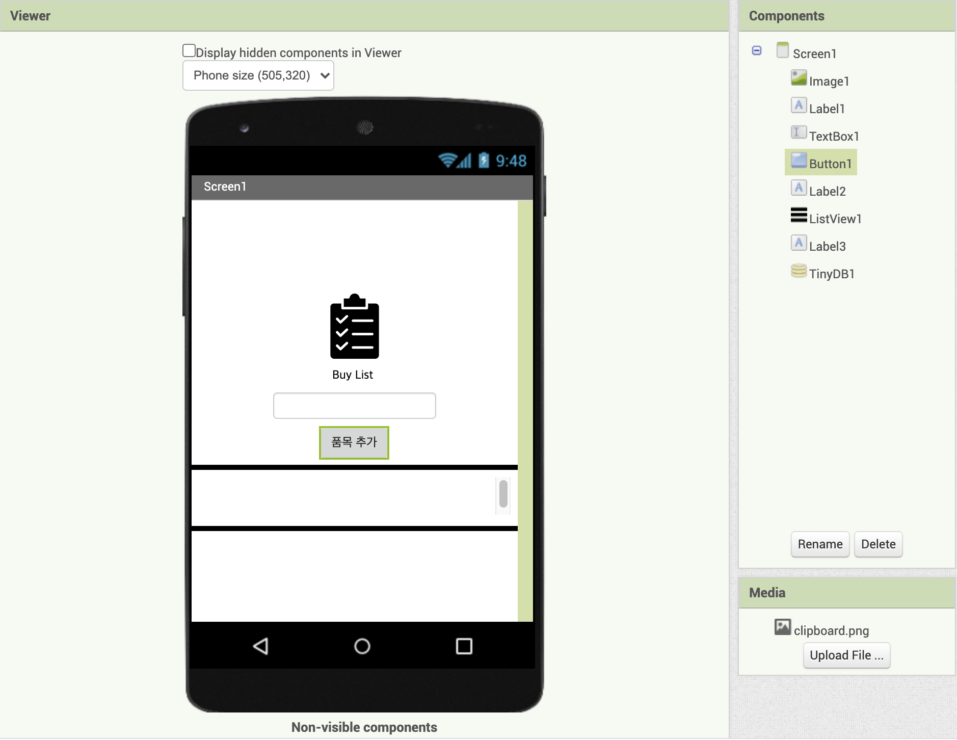 스크린 위에서부터 이미지, 레이블, 텍스트박스 리스트 뷰를 배치한다. 그리고 데이터베이스 역할을 수행하는 TinyDB를 추가한다.