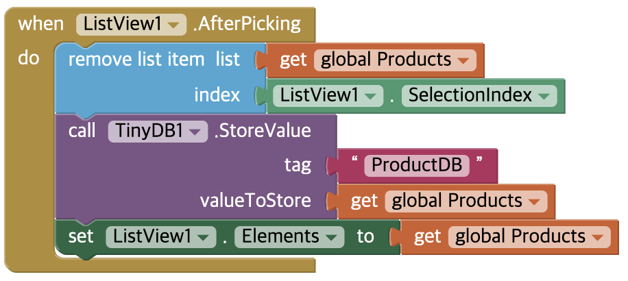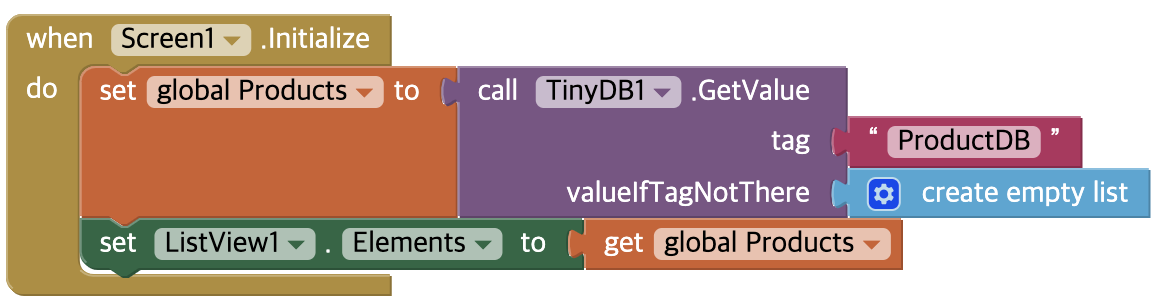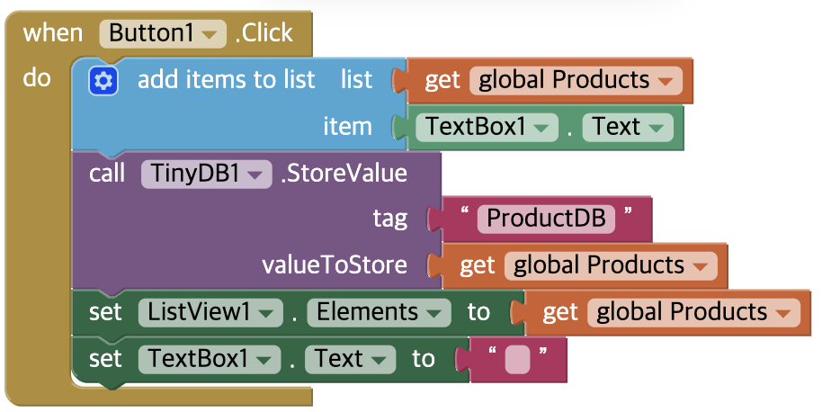 - TextBox에 할 일을 작성하고 "품목 추가" 버튼을 클릭하면 텍스트박스의 내용을 Products 리스트에 추가하며 새 항목이 추가된 리스트를 Tiny DB에 저장