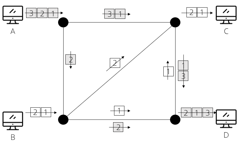 - 패킷을 미리 정해진 경로 없이 독립적으로 처리하여 교환하는 방식 - 망의 한 부분이 혼잡할 때 전송 패킷에 다른 경로를 배정 가능 → 융통성 있는 경로 설정 - 짧은 메시지의 패킷들을 전송할 때 효과적(재정렬 기능 필요) |