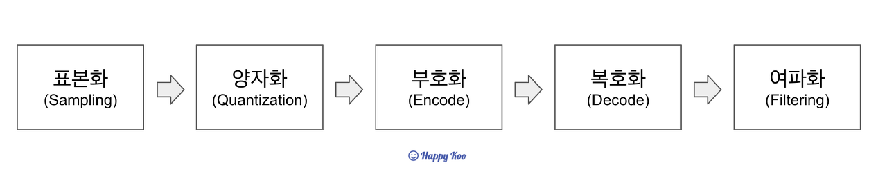 - 양자화 : 표본화된 신호의 진폭은 일정한 값이 아니라서 수량화를 수행하는 단계