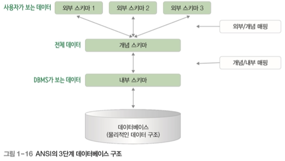 - 개념스키마의 데이터 → 내부 스키마의 물리적 장치 => 위치와 방법을 대응