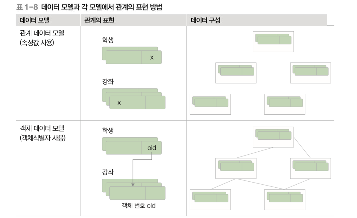 • 객체-관계 데이터 모델(object-relational data model) -> 관계 데이터 모델과 객체 데이터 모델의 장점을 결합한 모델